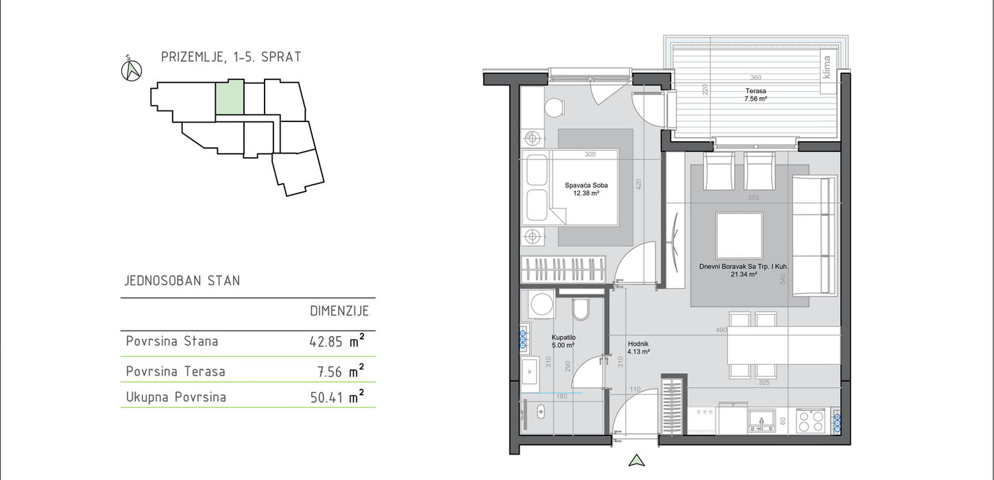 U ponudi su jednosobni stanovi površine 51 i 52 m². Odlikuje ih moderan, otvoren koncept rasporeda – kuhinja, trpezarija i dnevni boravak povezani su u skladnu cjelinu koja pruža osjećaj udobnosti, a dodatnu vrijednost donosi i prostrana terasa.